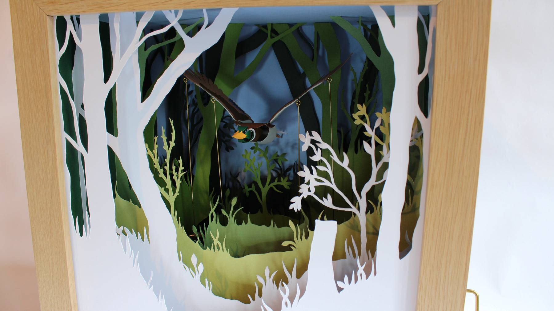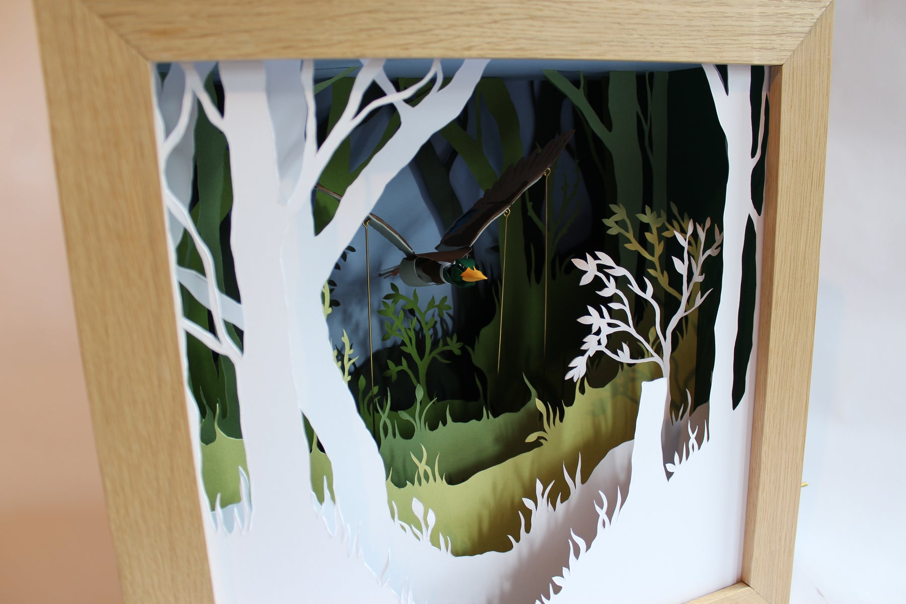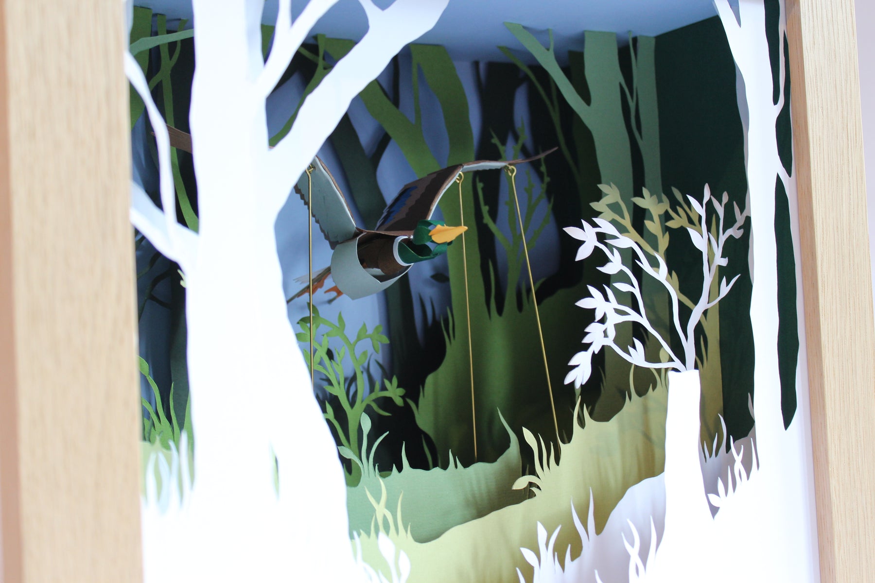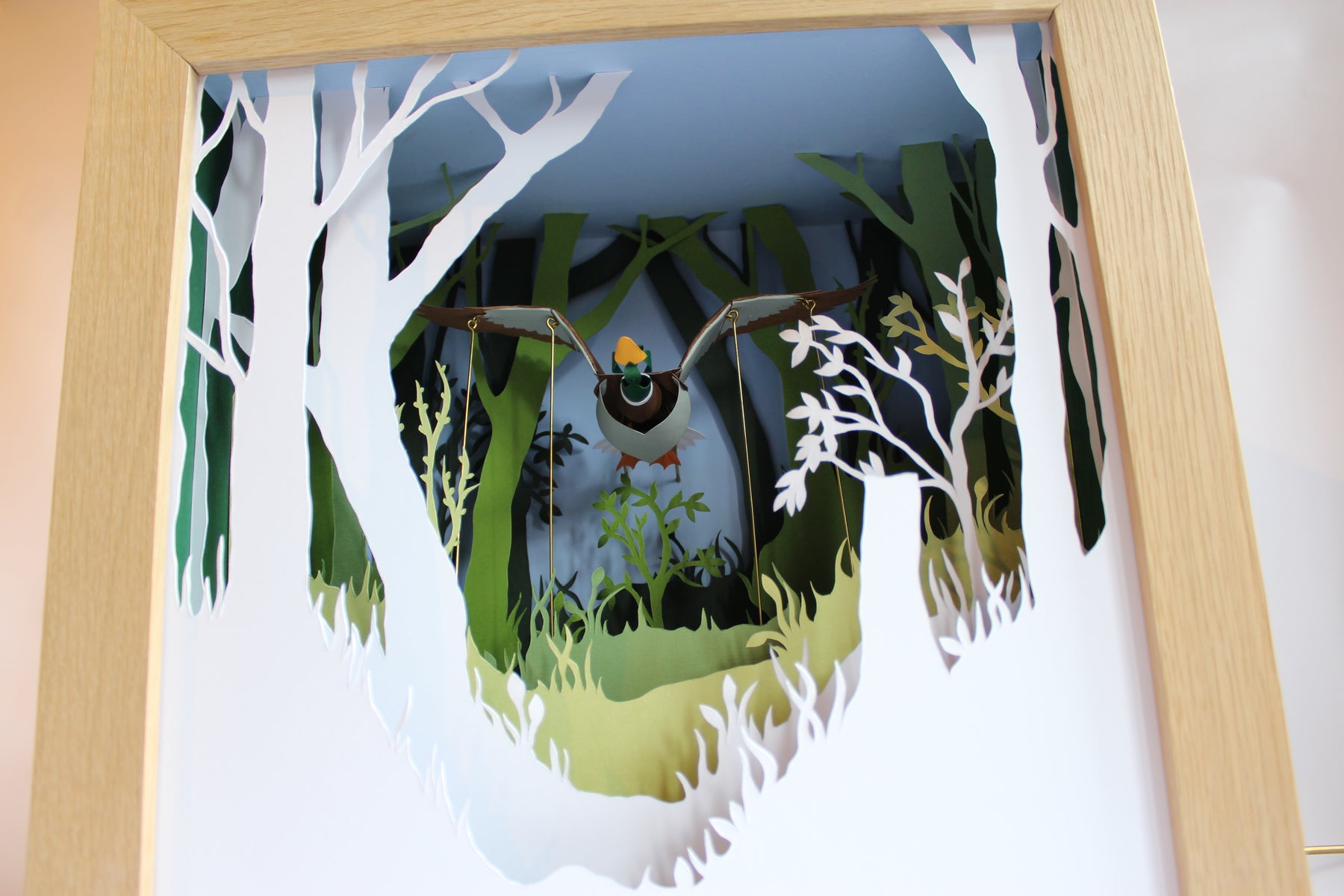 Woodland Mallard. Hand-cranked Paper-cut Kinetic Duck Sculpture.