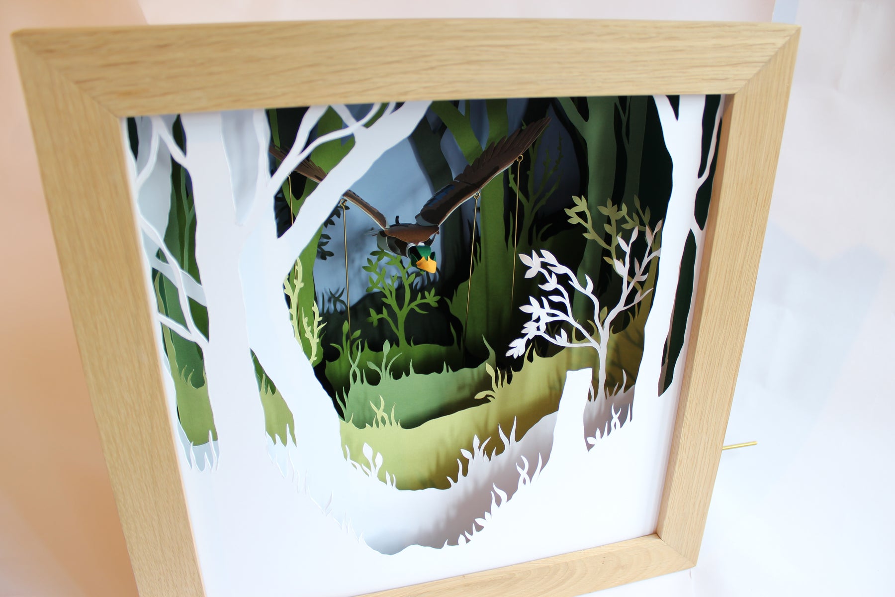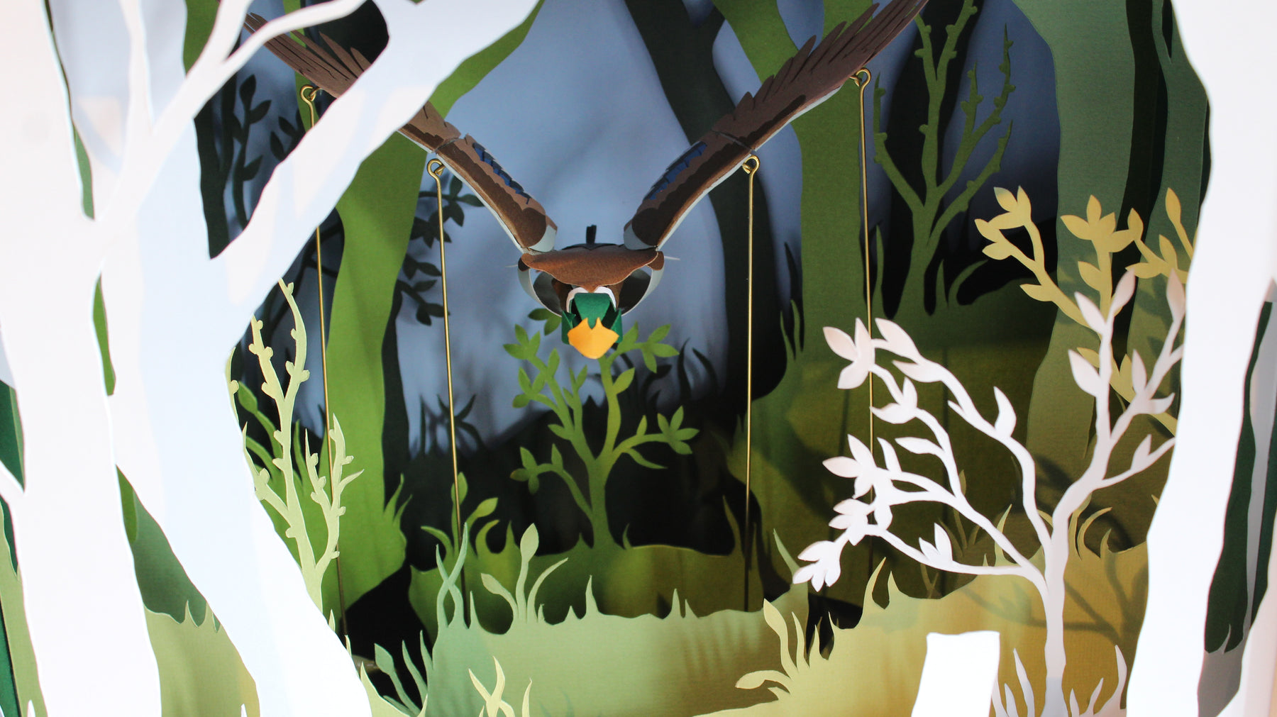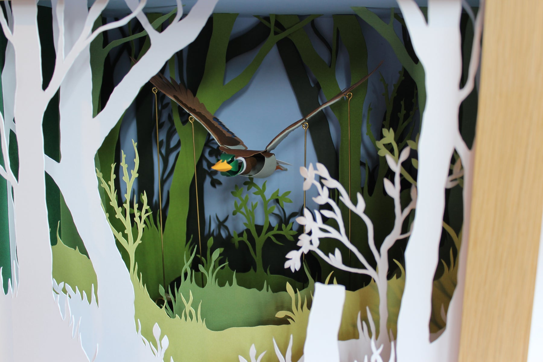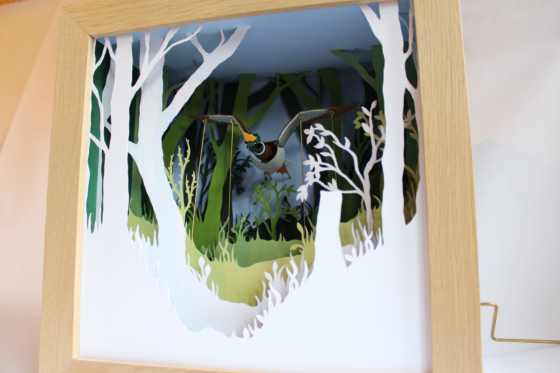 Woodland Mallard. Hand-cranked Paper-cut Kinetic Duck Sculpture.