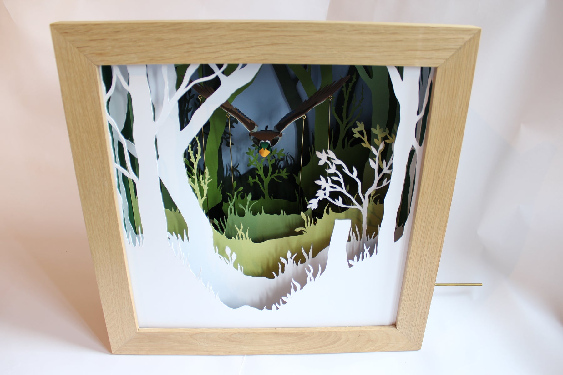 All paper has been cut and sculpted by hand, the brass mechanisms have been crafted by hand.