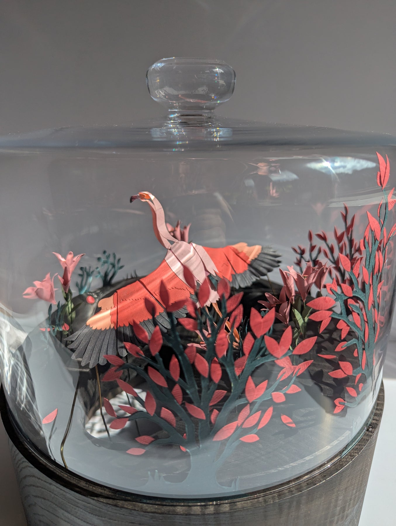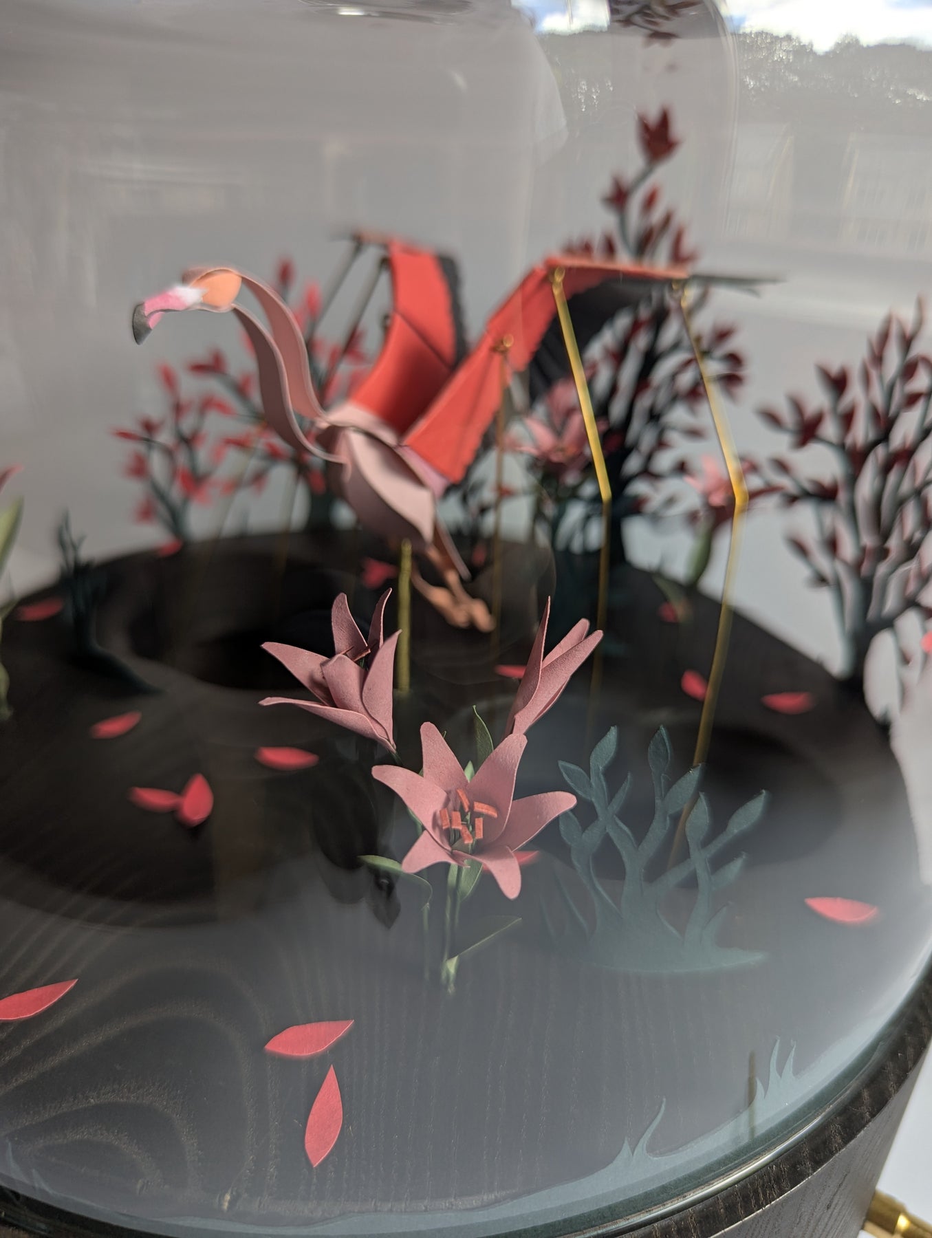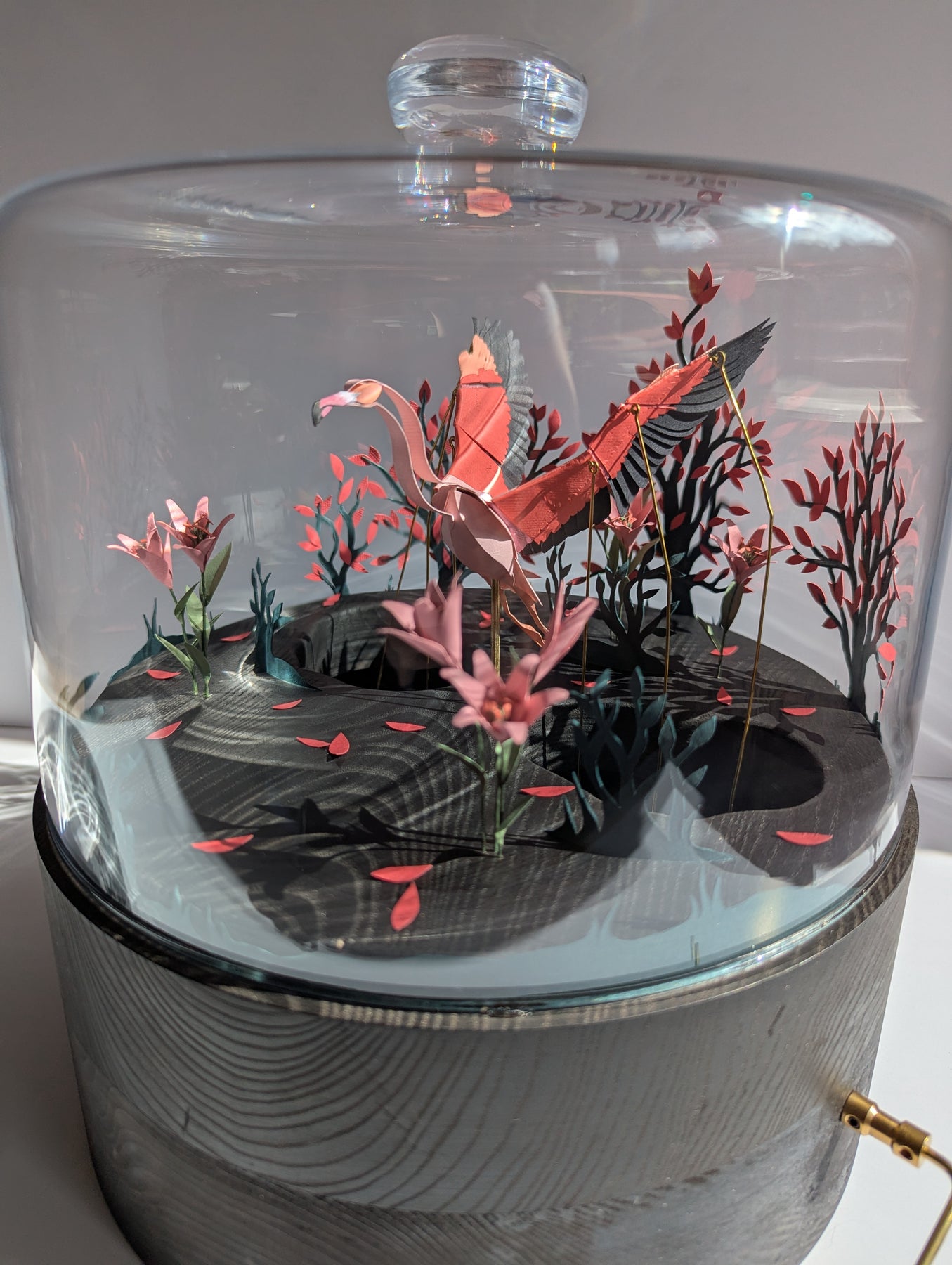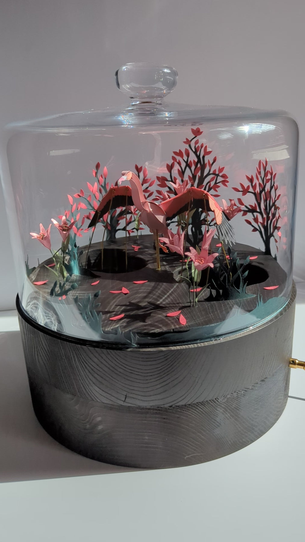 A paper cut Flamingo surrounded by lilies and pink leaf covered bushes, gently moves her wings and begins to fly as the handle is turned.