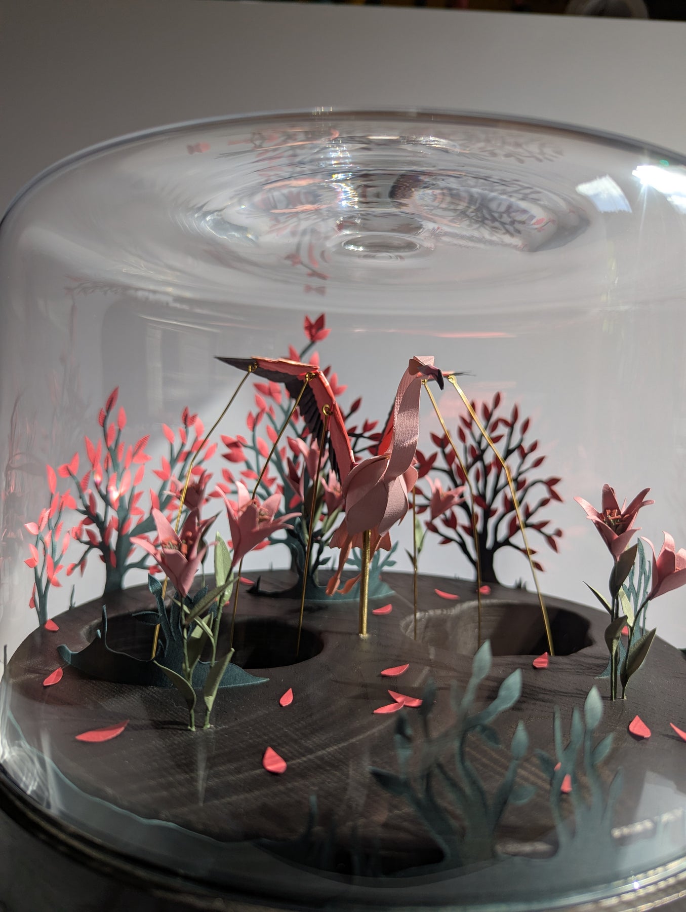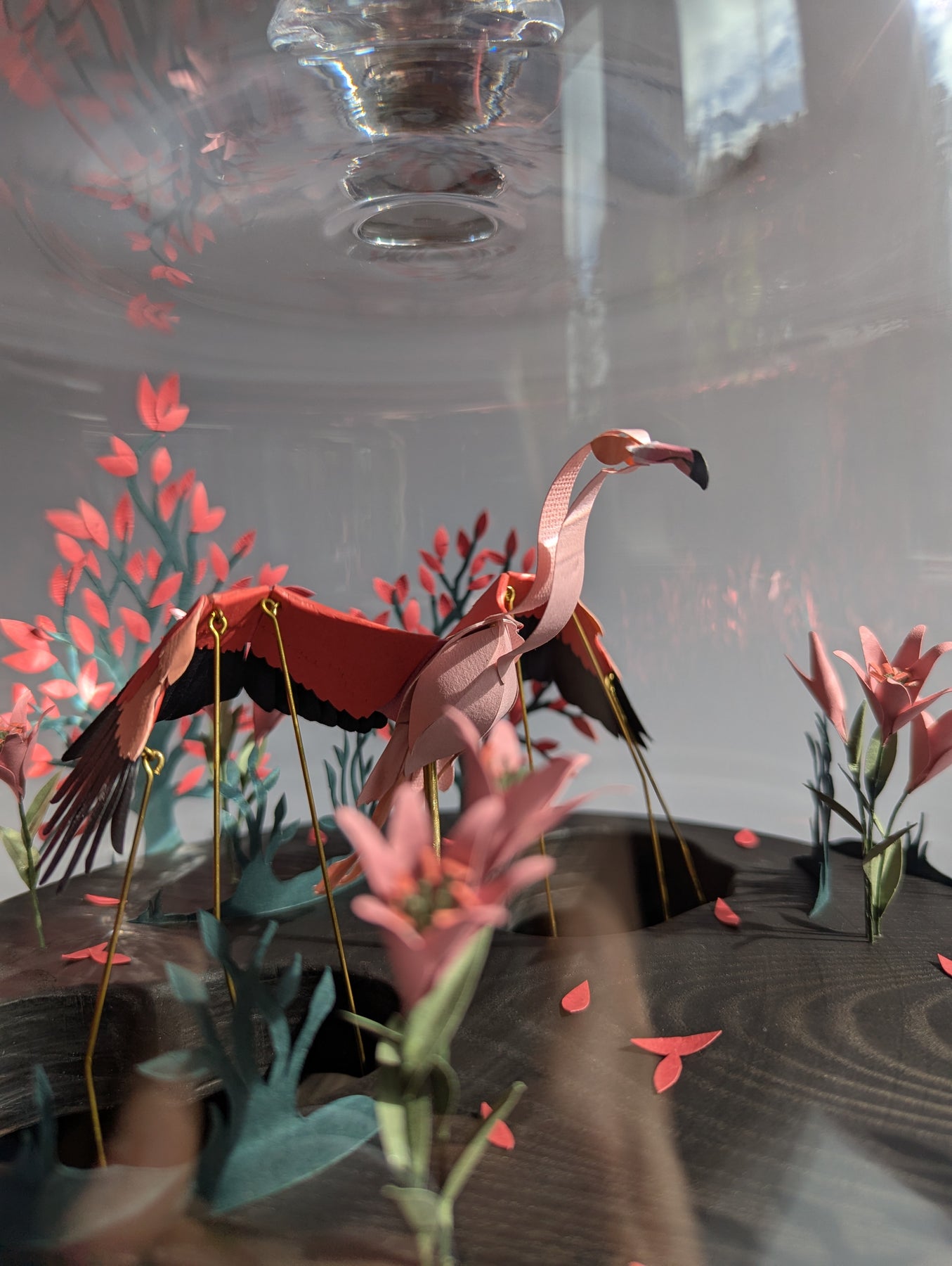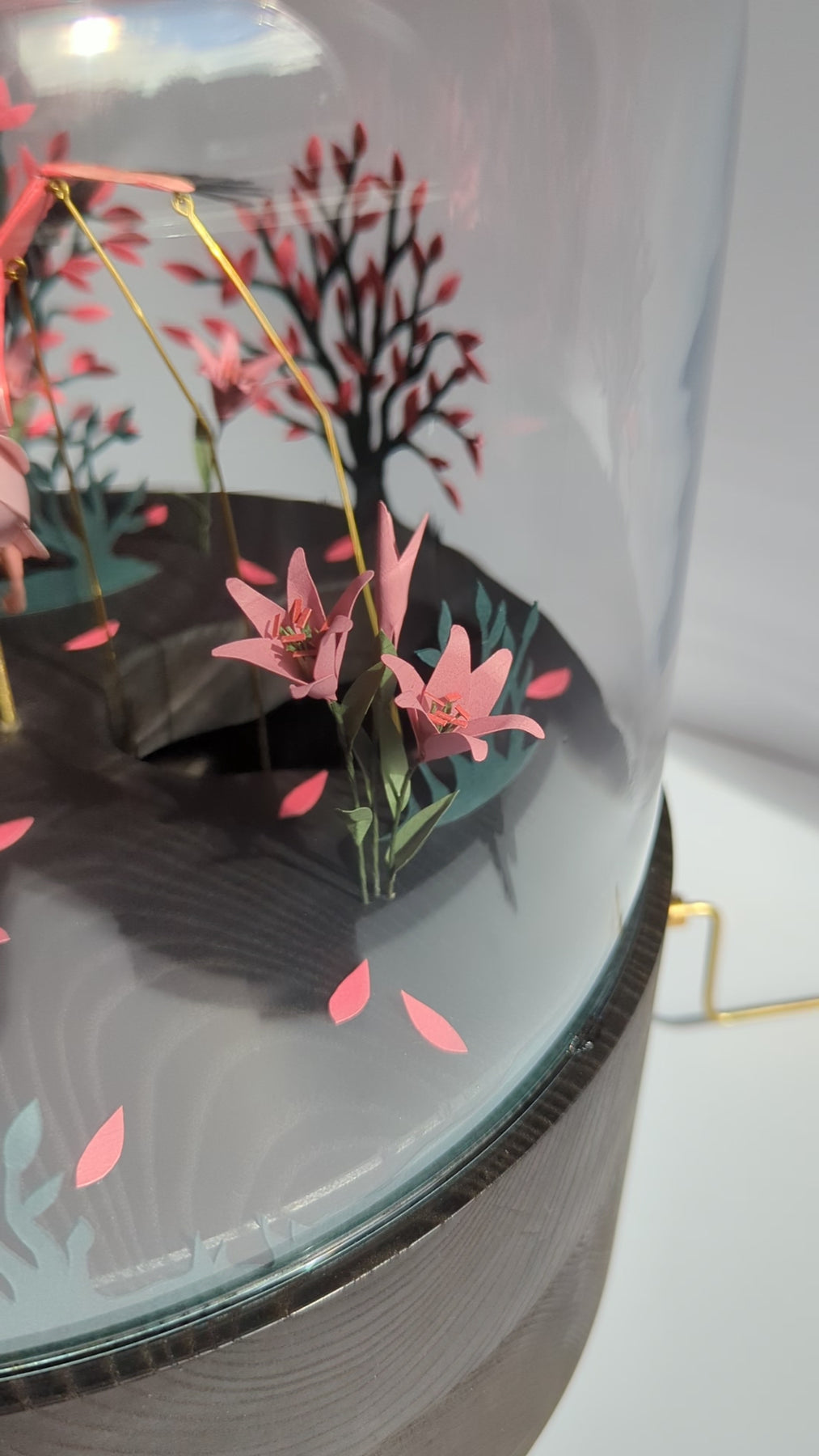 A paper cut Flamingo surrounded by lilies and pink leaf covered bushes, gently moves her wings and begins to fly as the handle is turned.