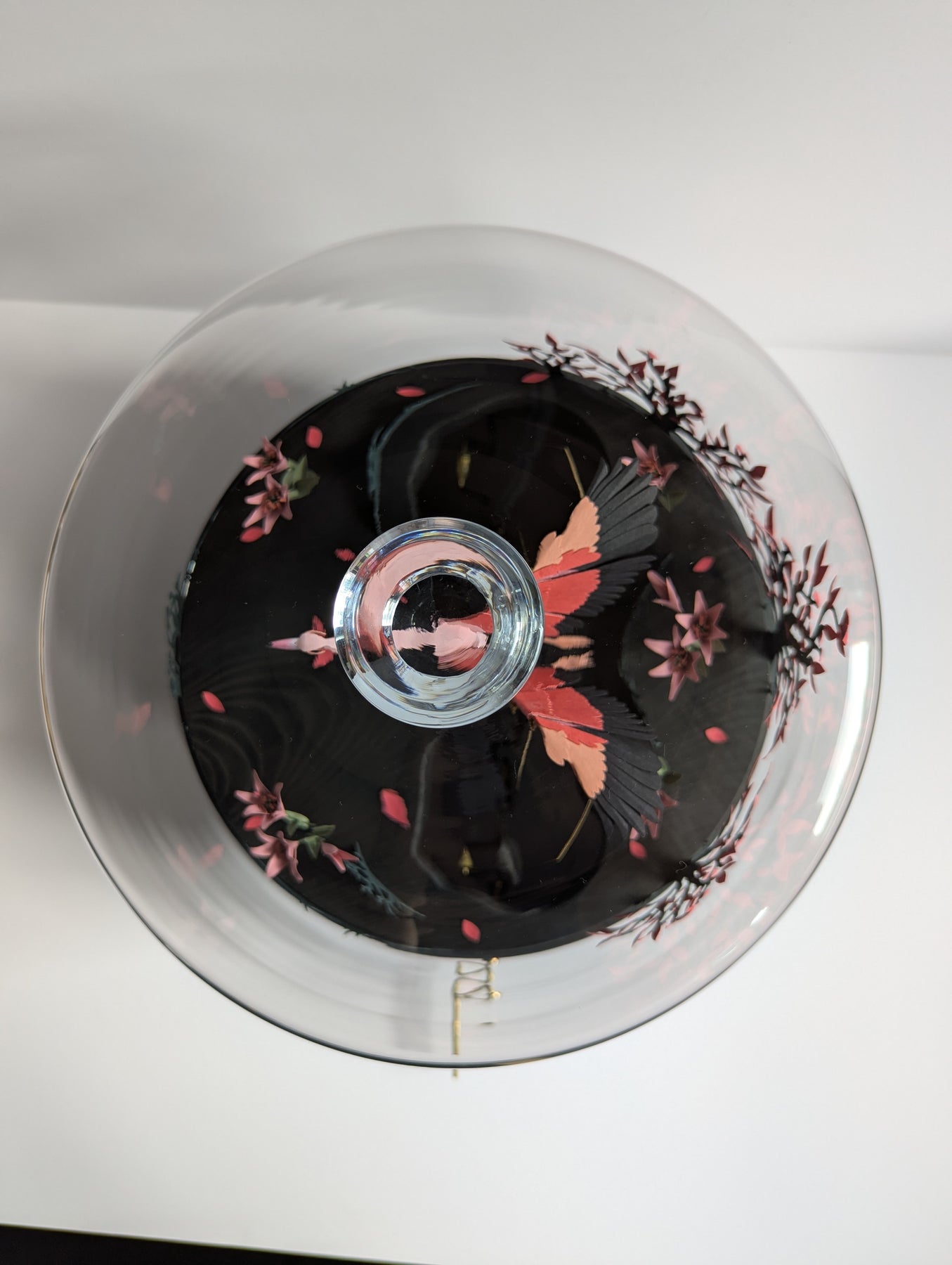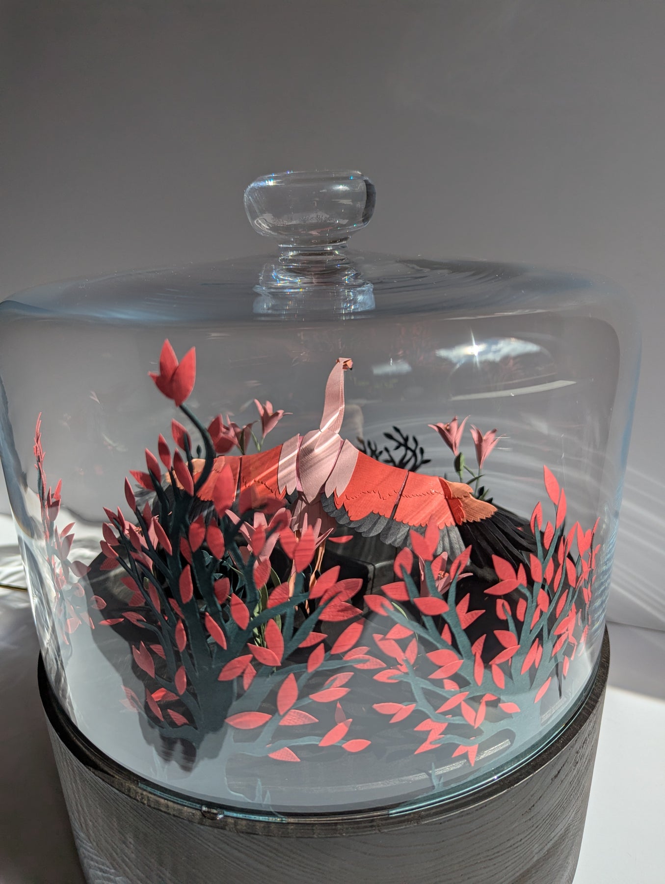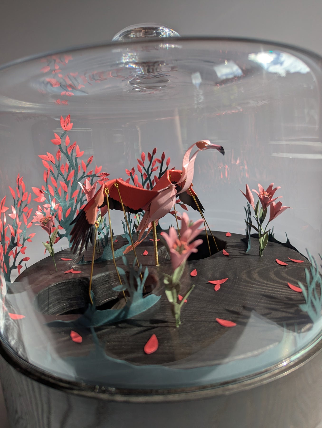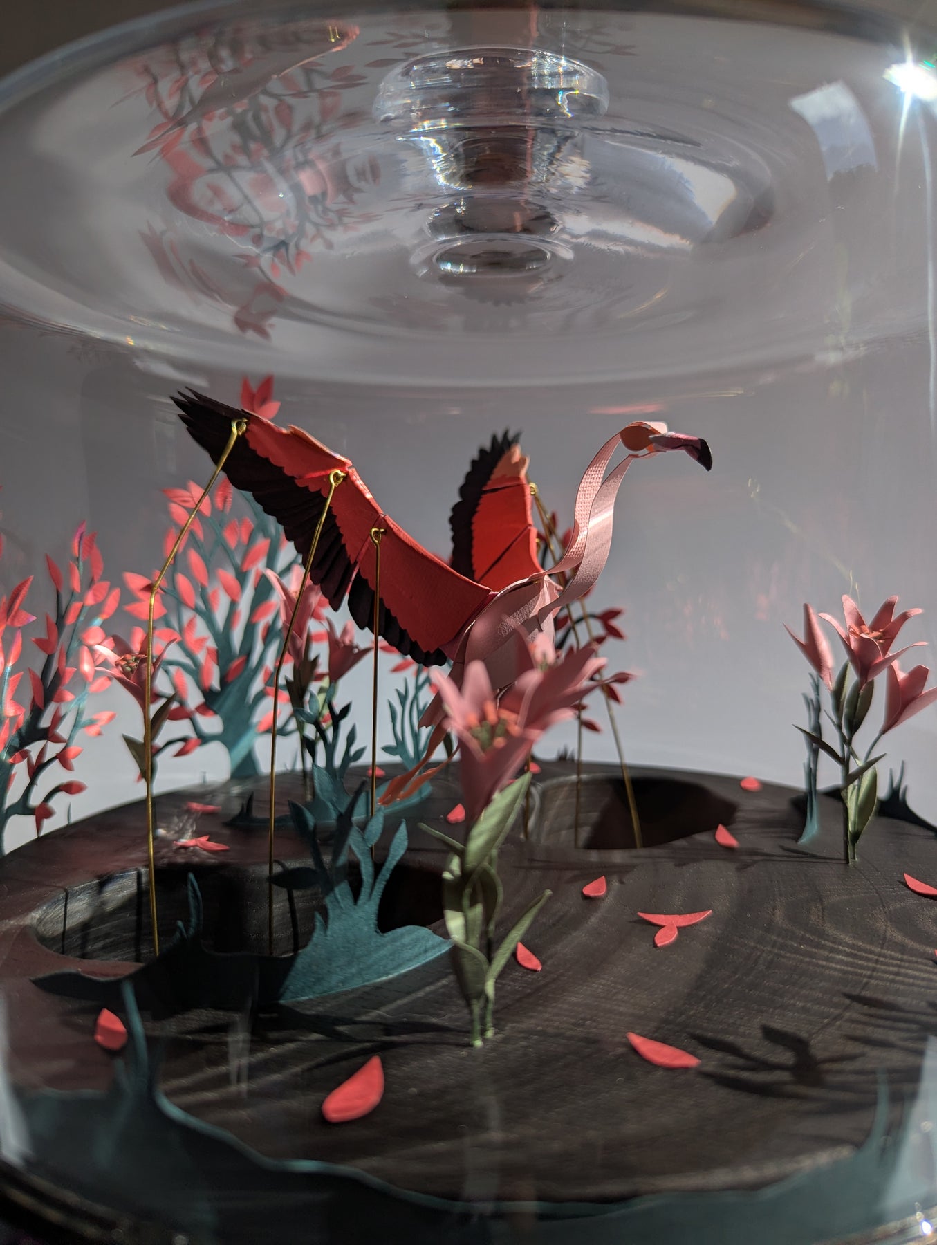 A paper cut Flamingo surrounded by lilies and pink leaf covered bushes, gently moves her wings and begins to fly as the handle is turned.