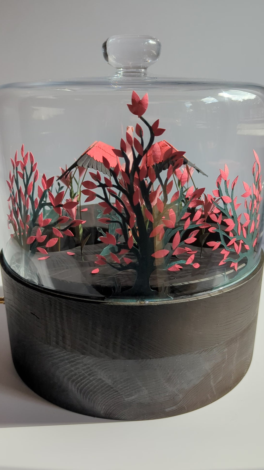 Hand cranked, kinetic, paper sculpture with a handle on the side to control the movement.