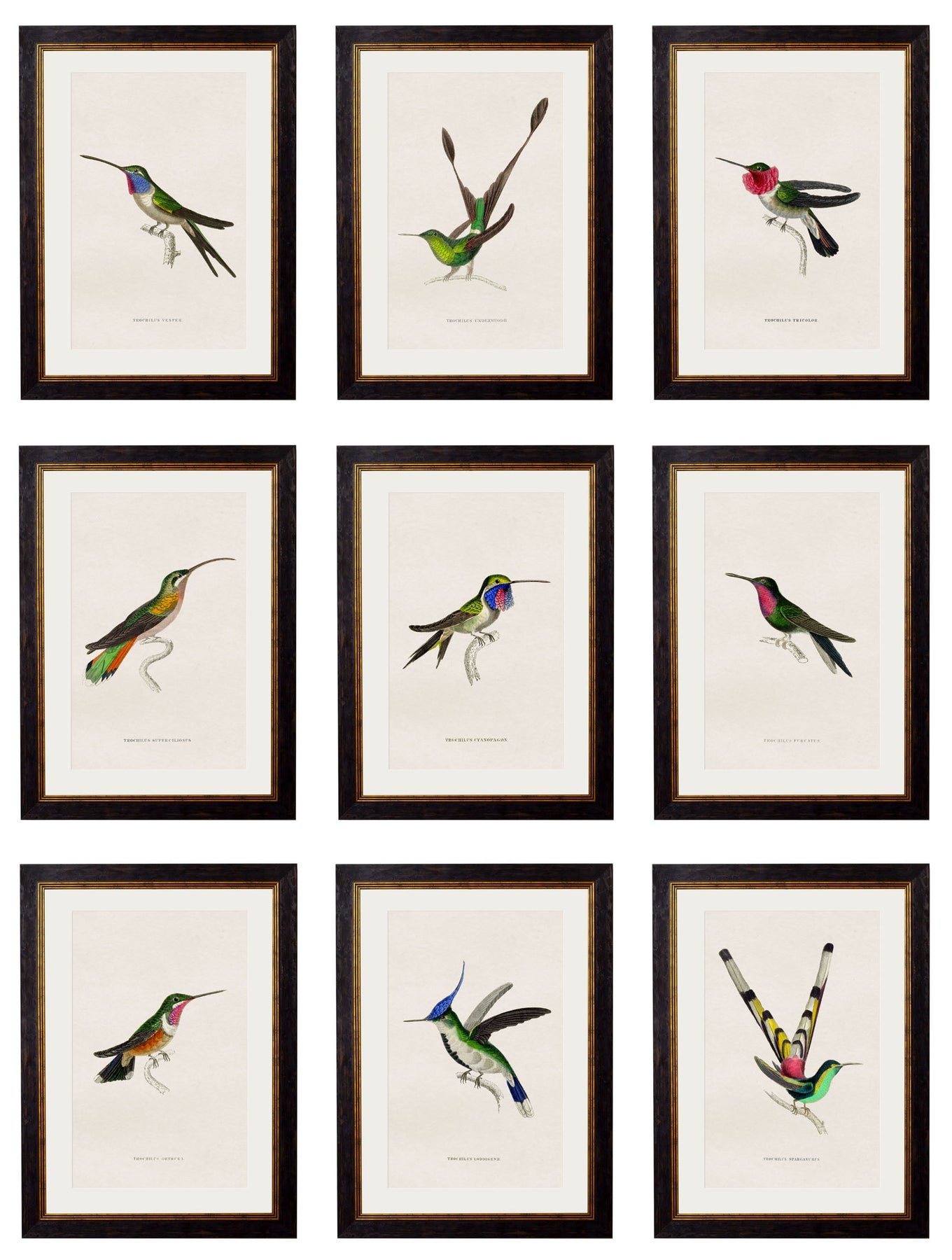 This beautiful collection of hummingbird illustrations revives an 1833 work by Sir William Jardine, 7th Baronet of Applegarth, a Scottish naturalist noted for editing The Naturalist’s Library series of natural history books. Illustrations like these were originally printed in black ink and then coloured by hand, and we’ve digitally remastered and enhanced them here in our Lancashire studio to bring their vivid colours back to life.