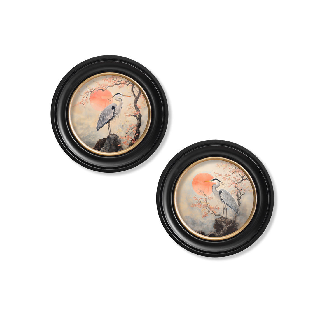 These prints capture the serene elegance of two Japanese-style herons, one facing left, the other right, rendered in soft, calming shades of oranges and pinks. Their graceful forms are accentuated by delicate brushwork, evoking a tranquil sunrise. Set against a subtle, muted backdrop, this composition radiates balance and peacefulness. Beautifully presented in our round Oxford Black and Gold frame, creating a refined and meditative focal point for any space.