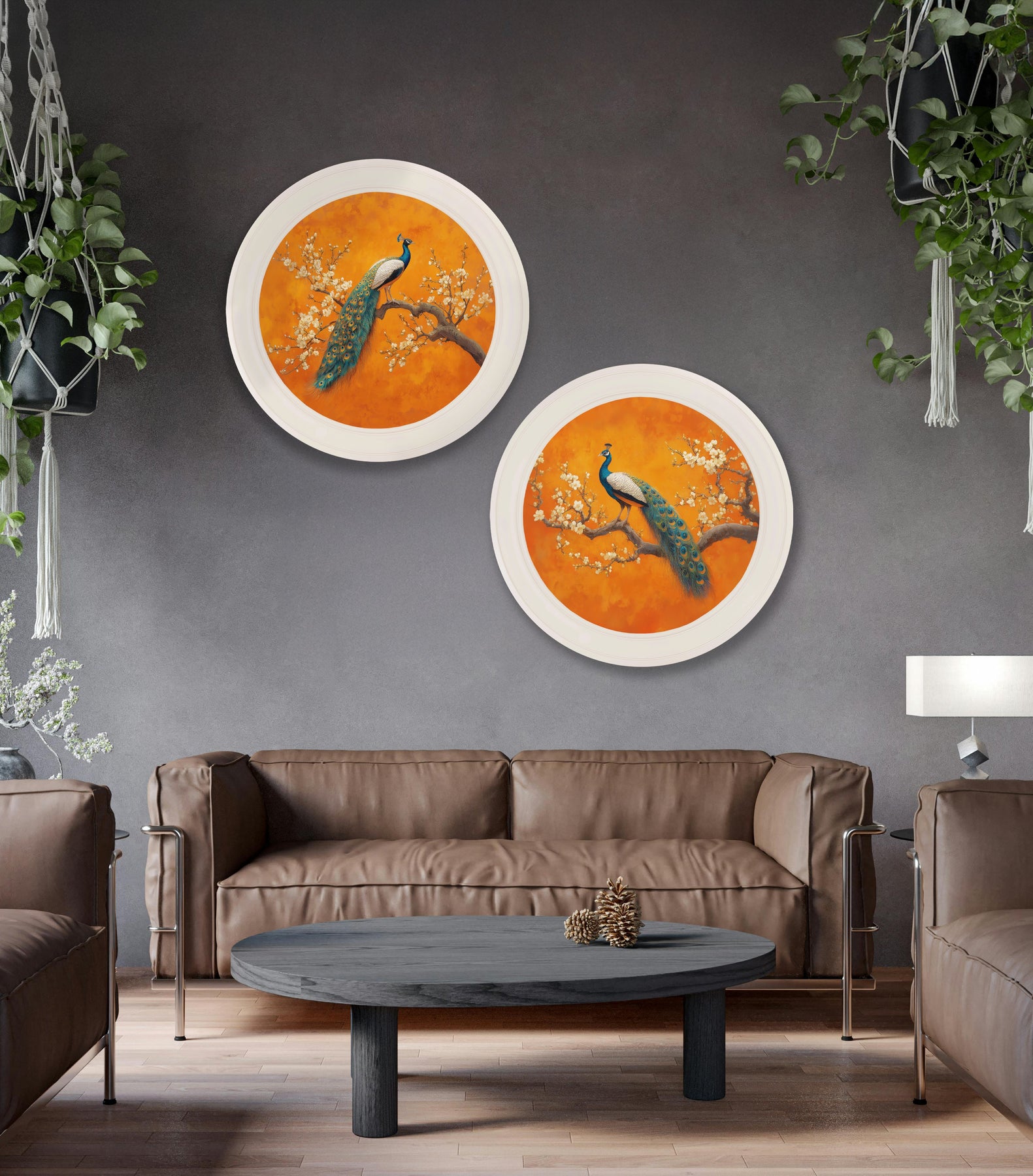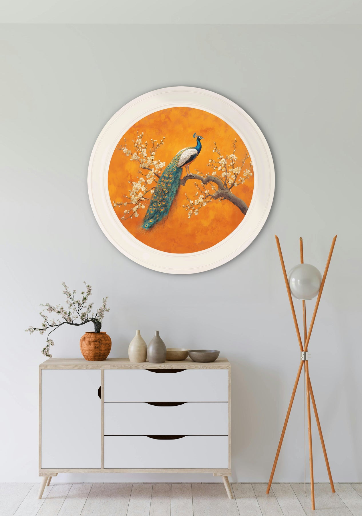 These striking prints feature a majestic peacock, full of elegance, perched gracefully among delicate blossoming branches. Rich teal and emerald feathers cascade beautifully against the warm saffron background, while the soft ivory blossoms add a gentle contrast. Set within our round Oxford Strong White frame, these prints have a luxurious, decorative feel that instantly draws the eye. They work beautifully as a standalone or paired with its companion.