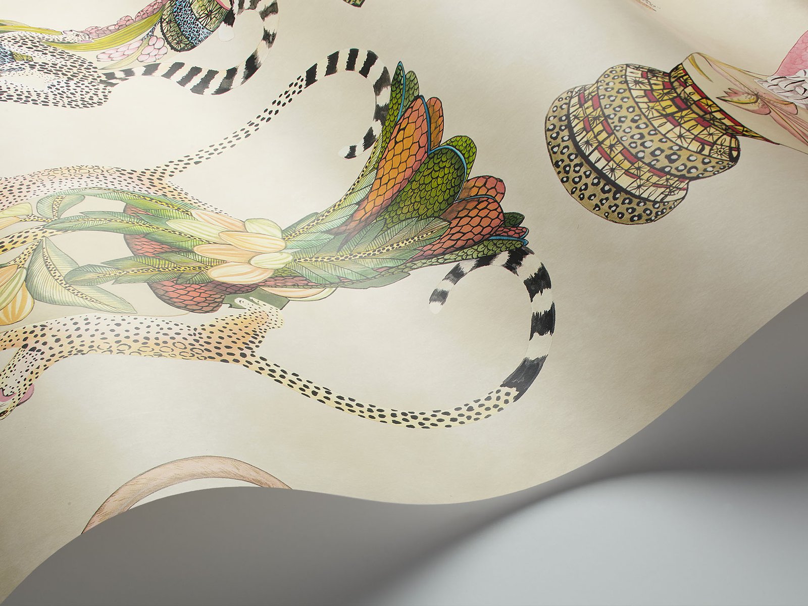 Khulu, meaning 'most important' is particularly apt for this grand design featuring classical vases entwined with leopards, parrots, lions and other African animals. This fabulous watercoloured motif pays tribute to these modern day collectable vessels which can be found in galleries and private collections around the world. Printed to an impressive 68.5cm repeat, the design is offered in various colourways including soft pinks and oranges on pale cream, a host of China blues on ivory, vivid greens and charcoal on ivory and finally a dramatic petrol and emerald on midnight blue.
