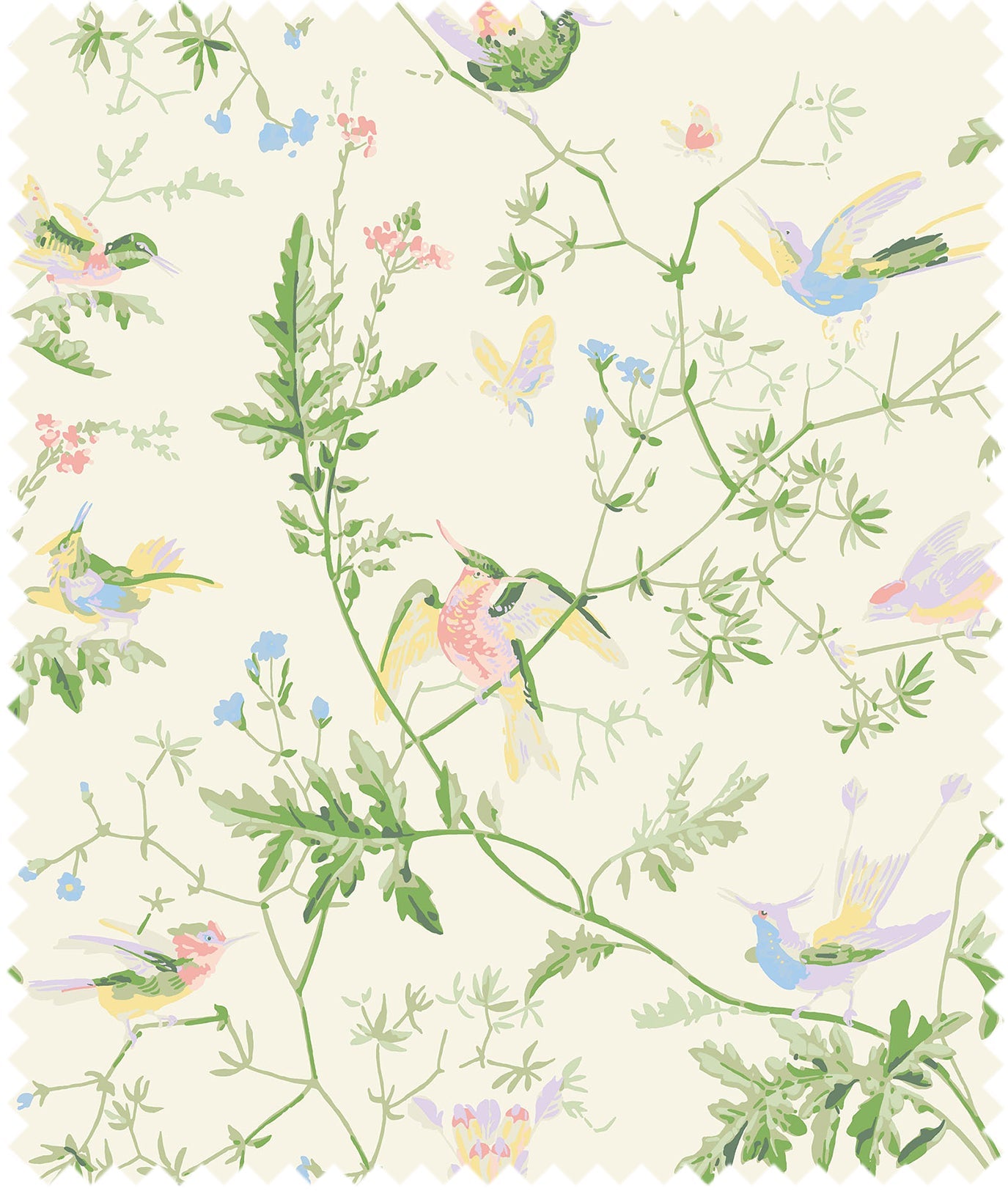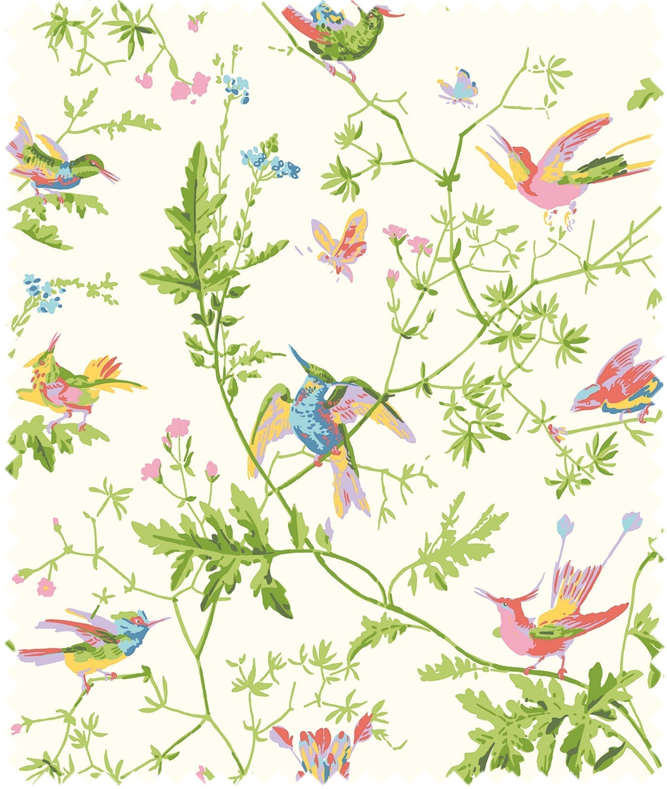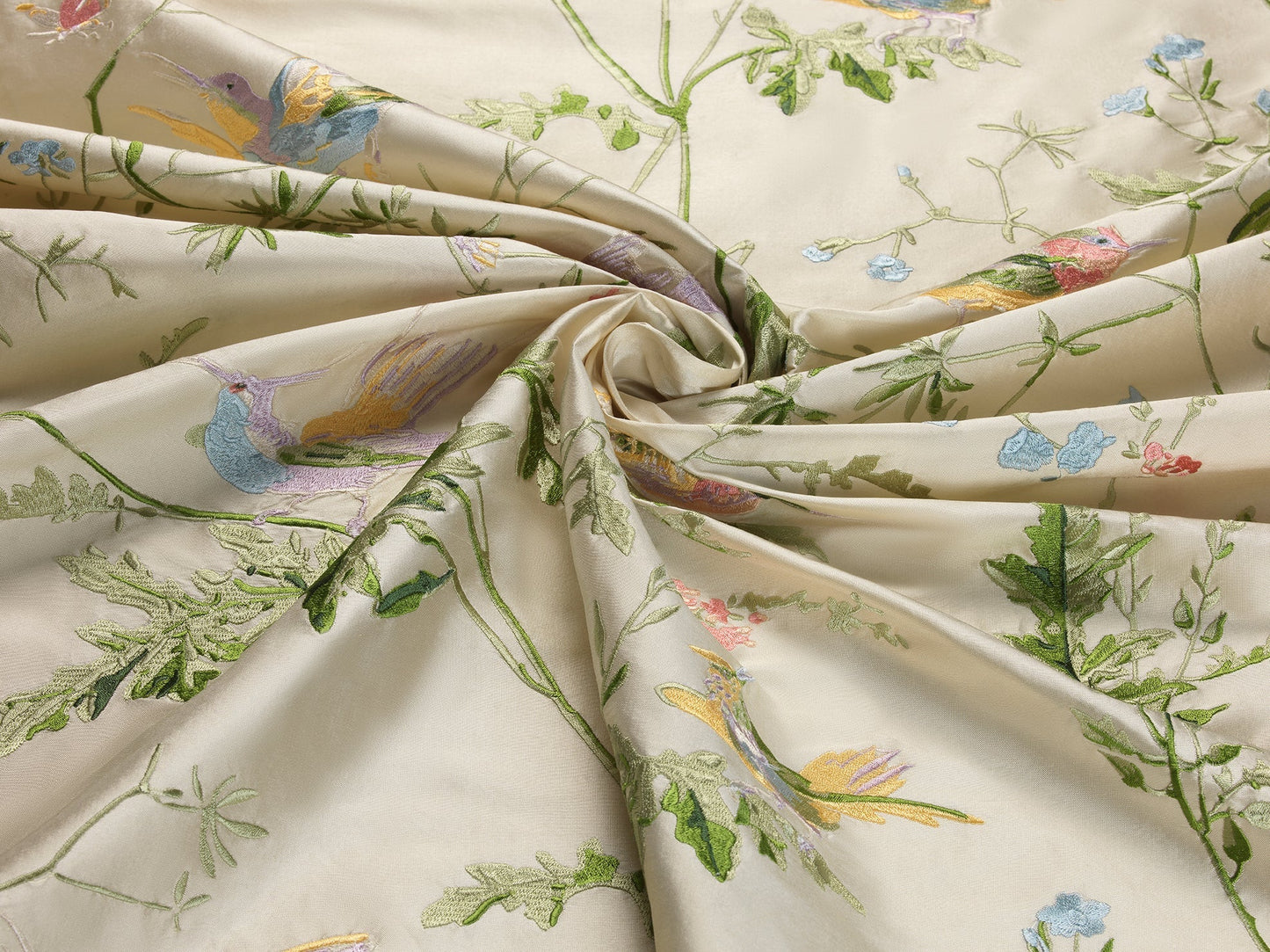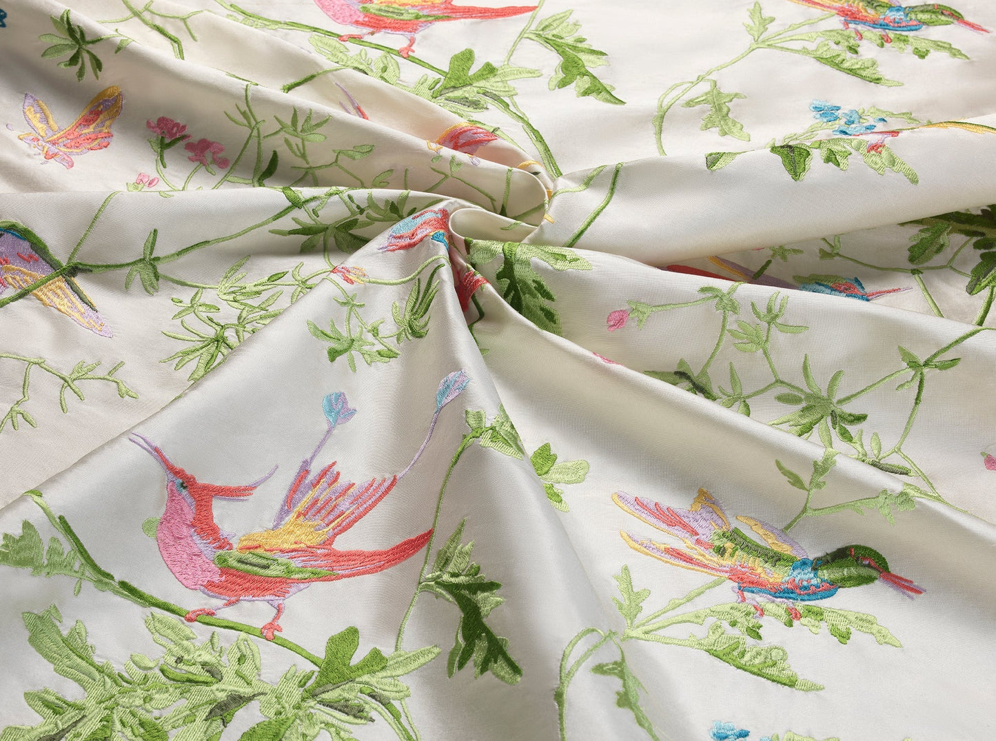 A romantic floral print, Hummingbirds depicts delicate birds perched on foliage and flowers. Originally a handmade block print wallpaper dating back to the 18th century from the Cole & Son archive, the intricate 100% embroidered silk reflects the original texture of the block printing technique. Hummingbirds is available as a fabric in Gold & Soft Grey, and Bright Multi. The silk embroidery base is suitable for decorative use including curtains, loose covers, pillows and spreads. Also available in 100% cotton.