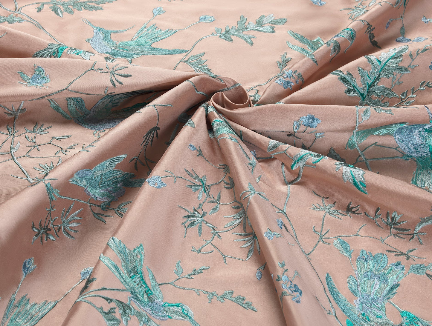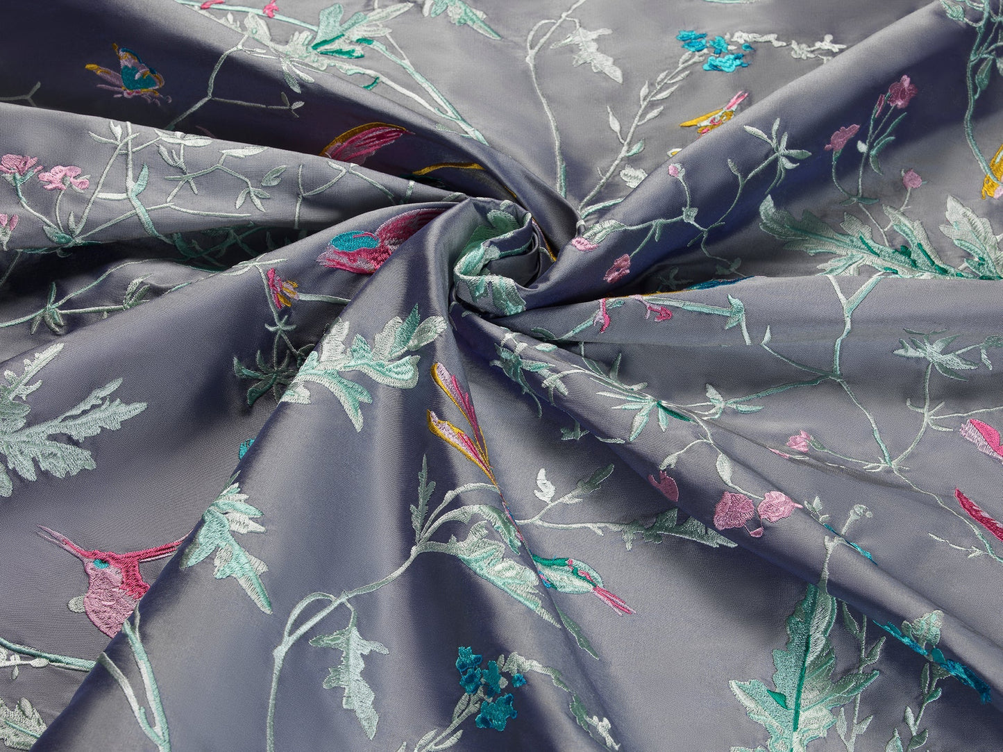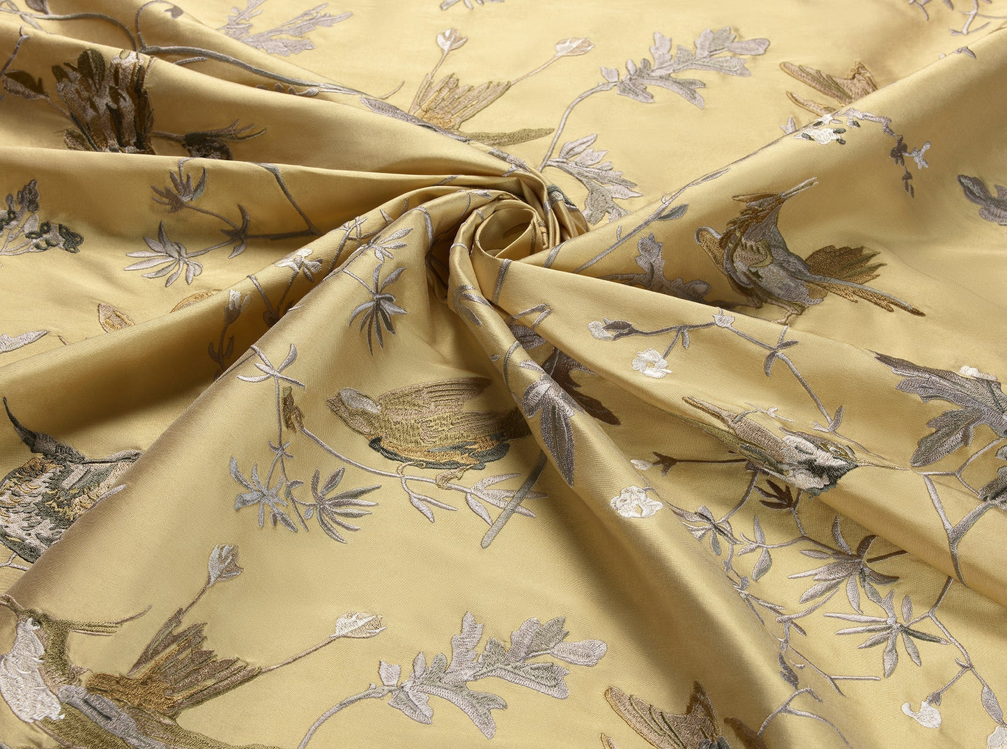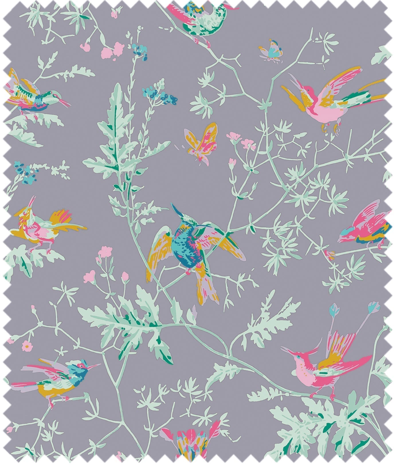 A romantic floral print, Hummingbirds depicts delicate birds perched on foliage and flowers. Originally a handmade block print wallpaper dating back to the 18th century from the Cole & Son archive, the intricate 100% embroidered silk reflects the original texture of the block printing technique. Hummingbirds is available as a fabric in Gold & Soft Grey, and Bright Multi. The silk embroidery base is suitable for decorative use including curtains, loose covers, pillows and spreads. Also available in 100% cotton.